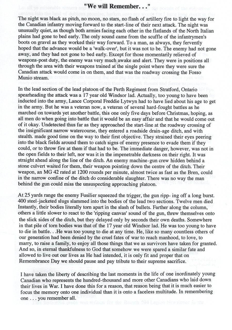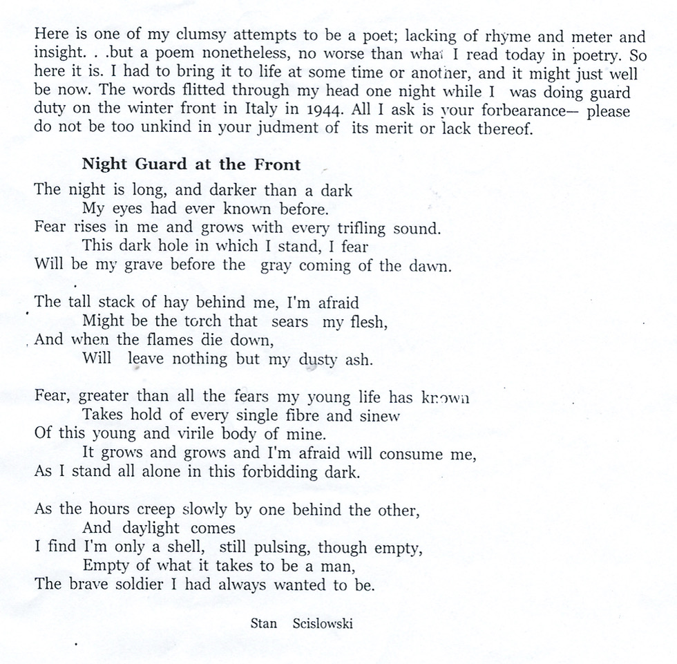 Very soon, after getting established, Stan began researching and writing accounts of his experience in the Army. With other Veterans, Stan made several trips to Italy to examine the old battlefields and honour his fallen comrades. His extensive knowledge of the Italian campaign is very apparent in his book “Not All of Us Were Brave” A member of the Royal Canadian Legion, Branch 594, Scislowski has been editor of the Branch bulletin for 32 years.
